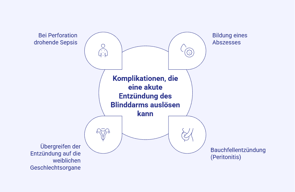 Eine akute Blinddarmentzündung tritt plötzlich auf, schreitet innerhalb von Stunden voran und erfordert eine zügige Diagnostik, um die Therapiemaßnahmen schnell einleiten zu können. Bleibt sie unbehandelt, erfasst die Entzündung im schlimmsten Fall alle Wandschichten des Wurmfortsatzes. Das Ergebnis sind Gewebeschäden (infolge einer entzündungsbedingten Nekrose des Darmgewebes), aus denen sich ein Durchbruch des Darms mit nachfolgender Bauchfellentzündung (Peritonitis) entwickeln kann. Dieser Zustand ist lebensbedrohlich und eine zentrale Komplikation der Appendizitis.