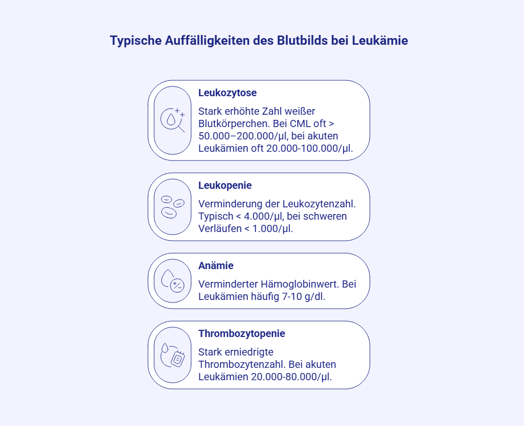 Da es bei Blutkrebs zu Verschiebungen in der Produktion der verschiedenen Zellen kommt, sind eine hohe Anzahl unreifer weißer Blutzellen und ein auffälliges Missverhältnis der Blutzellen untereinander wichtige Indizien, die auf eine Leukämie hinweisen.