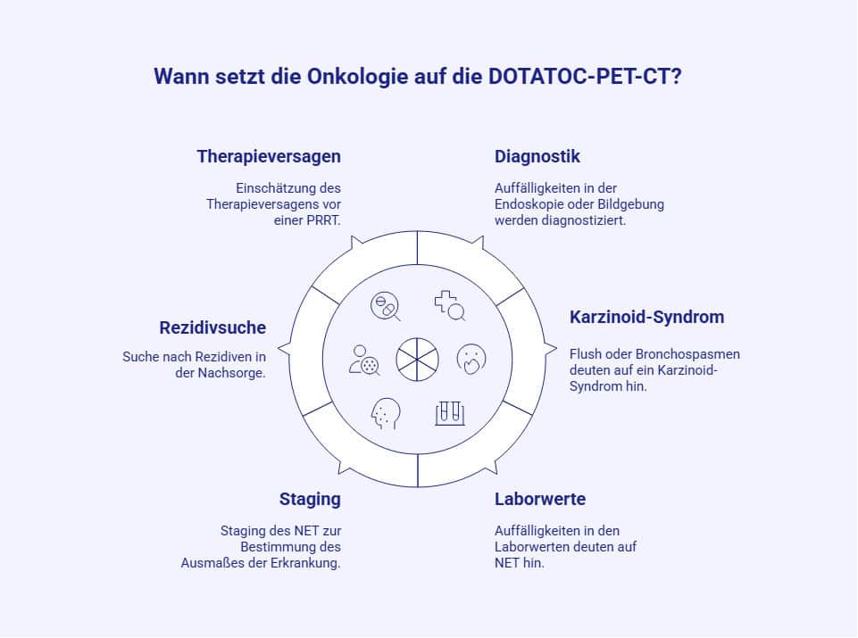 In der klinischen Praxis kommt die DOTATOC-PET-CT primär beim Verdacht auf einen NET zum Einsatz, sofern sich dieser durch eine konventionelle Bildgebung (beispielsweise mittels CT oder Magnetresonanztomographie (MRT) nicht ausreichend abklären lässt. Fälle, in denen eine DOTATOC-Untersuchung in Erwägung zu ziehen ist, sind unter anderem:
