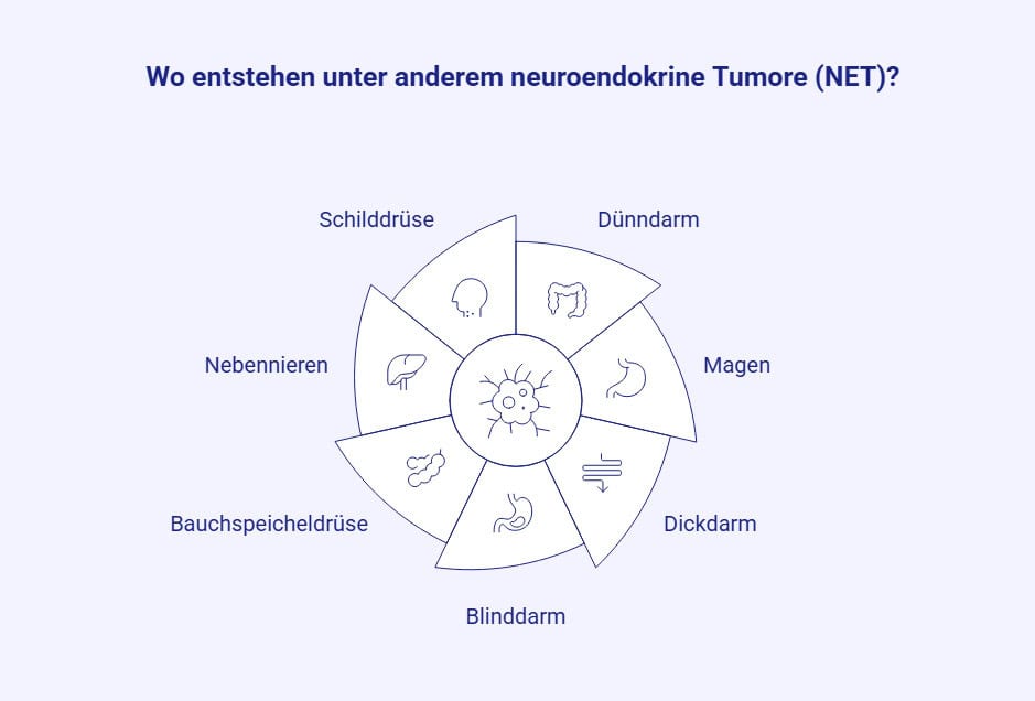 NET entwickeln sich aus Zellen des neuroendokrinen Systems, die im gesamten Körper verteilt sind und treten besonders häufig im Gastrointestinaltrakt auf, gefolgt von der Bauchspeicheldrüse und der Lunge. Seltener tauchen Befunde im Thymus, den Nebennieren oder anderen Organen auf. Die Weltgesundheitsorganisation (WHO) unterscheidet gut differenzierte NET in die Grade G1 bis G3 sowie schlecht differenzierte neuroendokrine Karzinome (NEC).