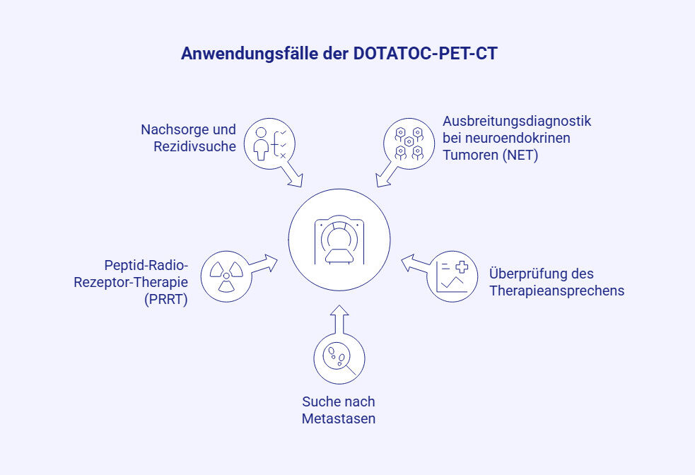 In der Nuklearmedizin wird die DOTATOC-PET-CT zur Klärung verschiedener klinischer Fragestellungen eingesetzt. Im Mittelpunkt steht die Ausbreitungsdiagnostik (Staging) bei NET. Das Verfahren ermöglicht die präzise Darstellung des Primärtumors sowie den Nachweis von Lymphknoten- und Fernmetastasen. Informationen aus der Untersuchung fließen gleichzeitig in die Therapieplanung (unter anderem für die Peptid-Rezeptor-Radiotherapie, PRRT)und Kontrolle ein.