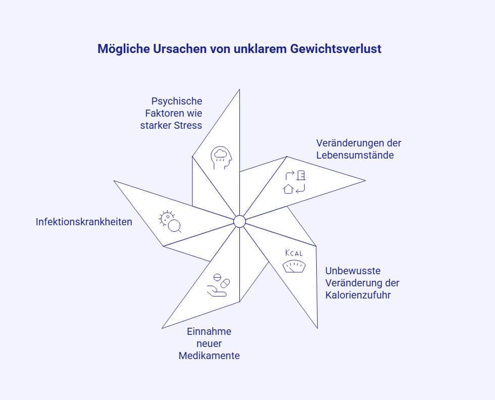 in Betracht. Kommt jedoch keine der möglichen Erklärungen als Auslöser infrage, ist eine umfassende Diagnostik erforderlich, um eine pathologische Relevanz des Gewichtsverlustes (zum Beispiel durch Krebs) auszuschließen. Dies gilt insbesondere dann, wenn zusätzliche Symptome auftreten, die auf eine organische Ursache hindeuten.