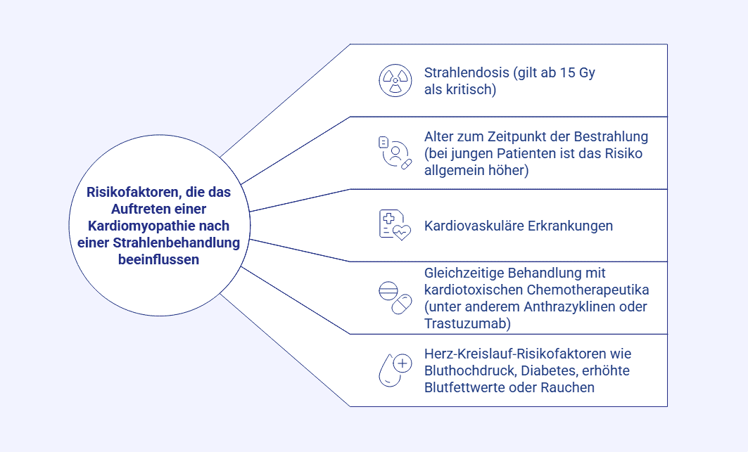 Das Risiko des Auftretens einer Kardiomyopathie infolge einer Strahlenbehandlung hängt von mehreren Faktoren ab. Die Strahlendosis spielt dabei eine wichtige Rolle. Bereits ab 15 Gray (Gy) erhöht sich das Risiko, wobei mit jeder Steigerung auch die Gefahr des Entstehens einer Kardiomyopathie zunimmt [1]. Zudem beeinflusst die mittlere Herzdosis, also die durchschnittliche Strahlenbelastung des gesamten Herzens, die Wahrscheinlichkeit einer Kardiomyopathie.