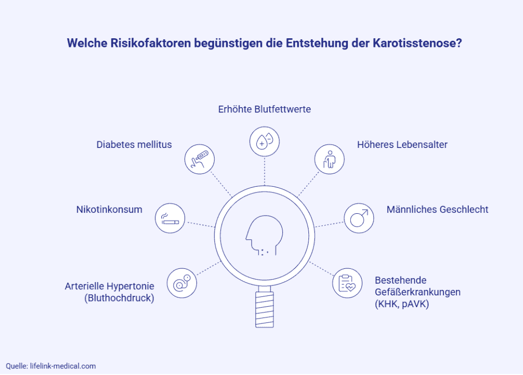 Aufgrund des engen Zusammenhangs zwischen Karotisstenose und Arteriosklerose haben beide Pathologien im Wesentlichen auch dieselben Risikofaktoren, zu denen neben Bluthochdruck (arterielle Hypertonie) auch das Rauchen und das Vorliegen von Gefäßerkrankungen – beispielsweise die koronare Herzkrankheit (KHK) oder die periphere arterielle Verschlusskrankheit (pAVK) – zählen.