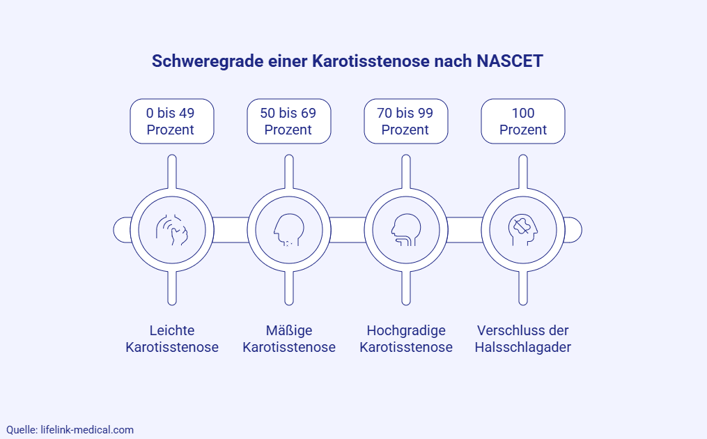 Für die Bewertung der Schwere des Verschlusses wird heute üblicherweise der NASCET-Standard (North American Symptomatic Carotid Endarterectomy Trial) herangezogen. Dabei wird die Verengung ins Verhältnis zum Lumen des unterhalb der Engstelle gelegenen Gefäßabschnitts der Arteria carotis interna gesetzt. Anhand des ermittelten Stenosegrades trifft der behandelnde Arzt die Therapieentscheidungen.
