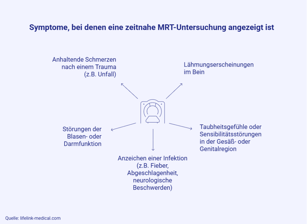 Eine wichtige Aufgabe der MRT ist die Unterscheidung zwischen Erkrankungen, die ihren Ursprung in der Wirbelsäule selbst haben – wie ein Bandscheibenvorfall (Prolaps) oder eine Verengung des Wirbelkanals (Spinalkanalstenose) – und solchen, die keinen direkten Bezug zu ihr haben (extraspinale Ereignisse). Schmerzen, die in das Gesäß und Bein ausstrahlen, können sowohl durch eine Nervenwurzelkompression an der Lendenwirbelsäule als auch infolge von Druck auf den Ischiasnerv (ausgelöst über die tiefe Glutealmuskulatur) entstehen.