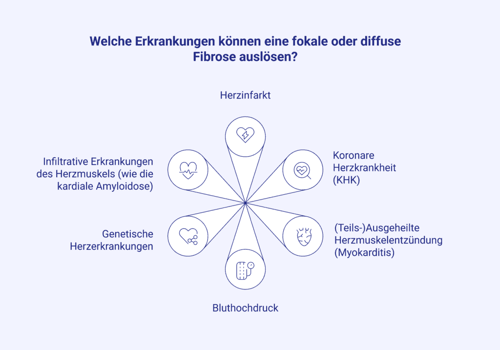 Die Kardiologie unterscheidet grundsätzlich zwischen zwei Formen der Fibrose: Fokale Veränderungen, die als klar abgrenzbare Narben auftreten, und diffuse Fibrose, die sich als gleichmäßige Verteilung von Bindegewebe im Myokard zeigt. Beide Formen unterscheiden sich in ihrer Entstehung. Fokale Myokardnarben entstehen unter anderem durch einen Herzinfarkt (Myokardinfarkt) oder eine Herzmuskelentzündung (Myokarditis) [2]. Diese scharf abgrenzbaren Areale sind mittels Late Gadolinium Enhancement (LGE) in der Magnetresonanztomographie (MRT) gut darstell- und quantifizierbar.