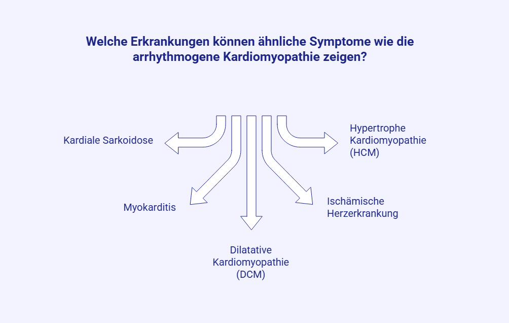 Aufgrund der Tatsache, dass verschiedene Erkrankungen den Herzmuskel in einer Art und Weise schädigen, wie es auch bei einer arrhythmogenen Kardiomyopathie der Fall ist, spielt die Differenzialdiagnostik eine wichtige Rolle. Mittels der Verteilungsmuster kann die PET-CT dazu beitragen, verschiedene Krankheitsbilder voneinander abzugrenzen.