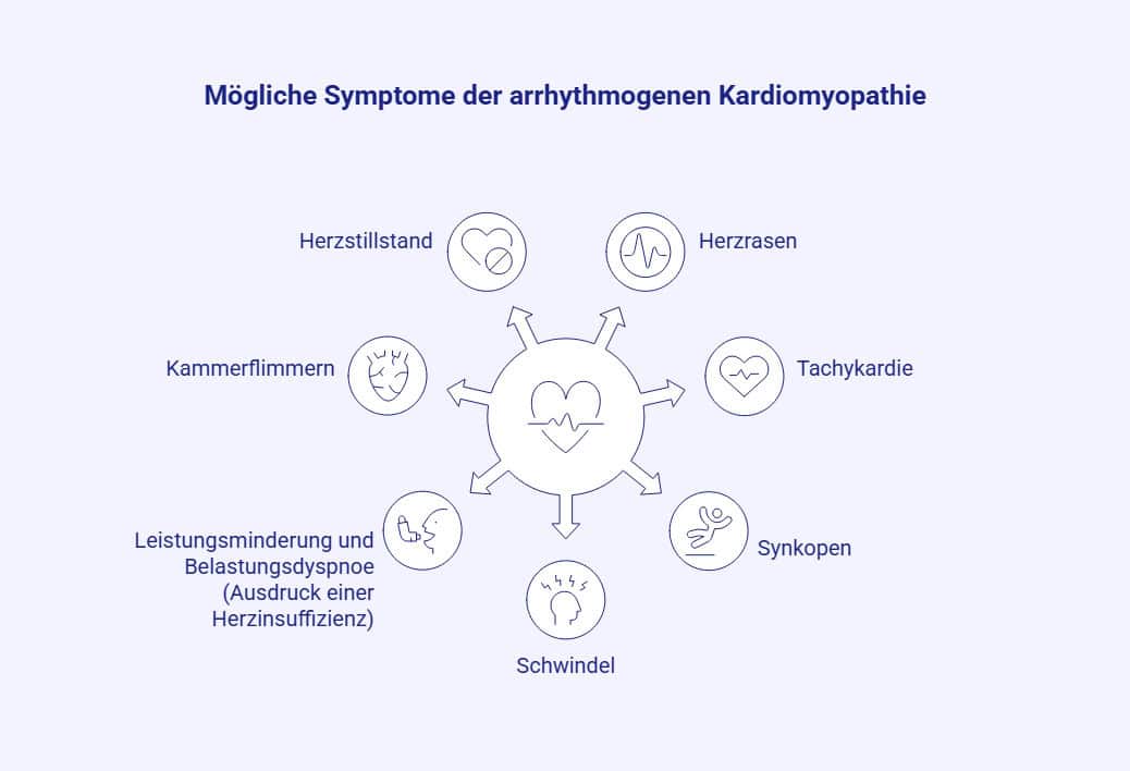 Klinisch äußert sich die arrhythmogene Kardiomyopathie durch Umbauprozesse der Herzmuskulatur, die fortschreitend durch Binde- und Fettgewebe ersetzt wird. Diese fibrofettige Transformation schafft die Grundlage für eine Situation, in der ventrikuläre Herzrhythmusstörungen begünstigt werden.