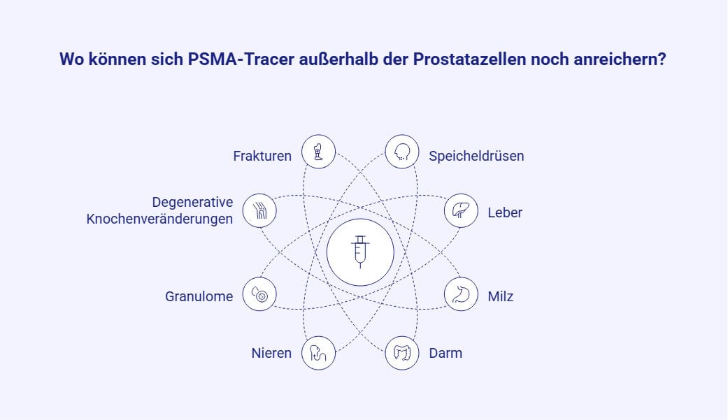 Dennoch ist zu berücksichtigen, dass die Methode Limitationen unterliegt, da ein Teil der Prostatakarzinome eine niedrige oder fehlende PSMA-Expression zeigt. Zudem treten unspezifische Anreicherungen des Tracers physiologisch in verschiedenen Organregionen auf. Diese führen gelegentlich zu falsch-positiven Befunden, worin für die Diagnostik eine besondere Herausforderung besteht.
